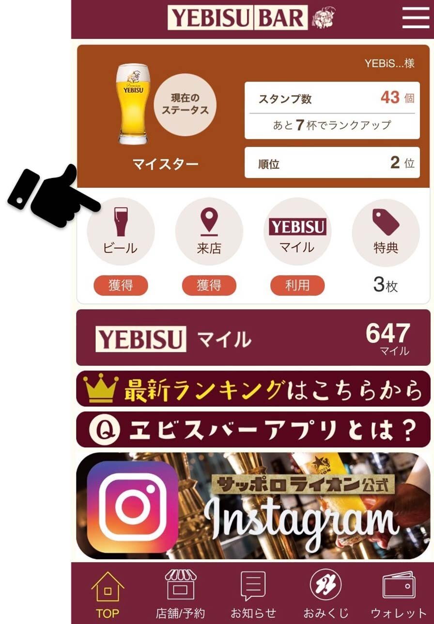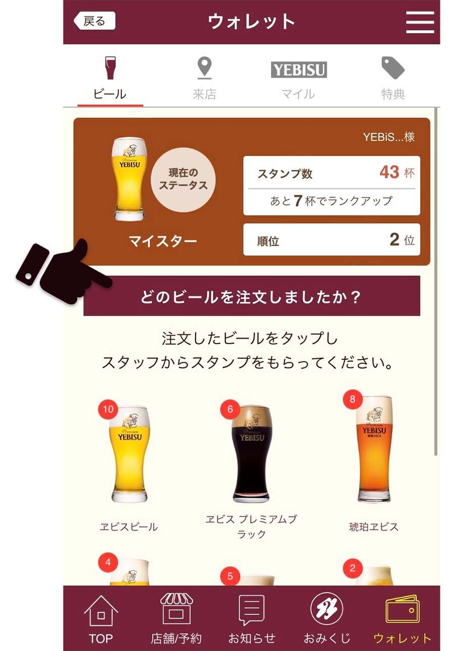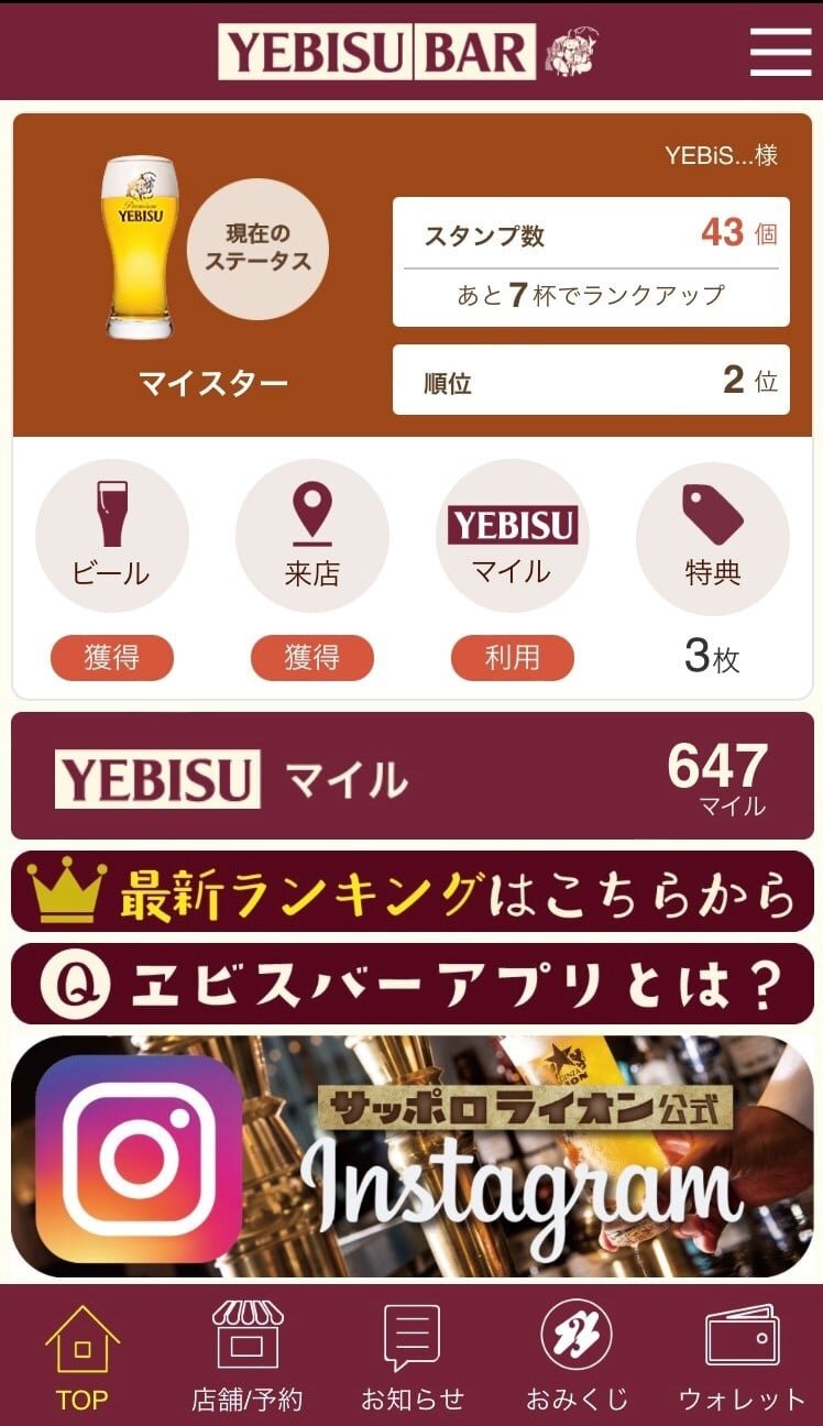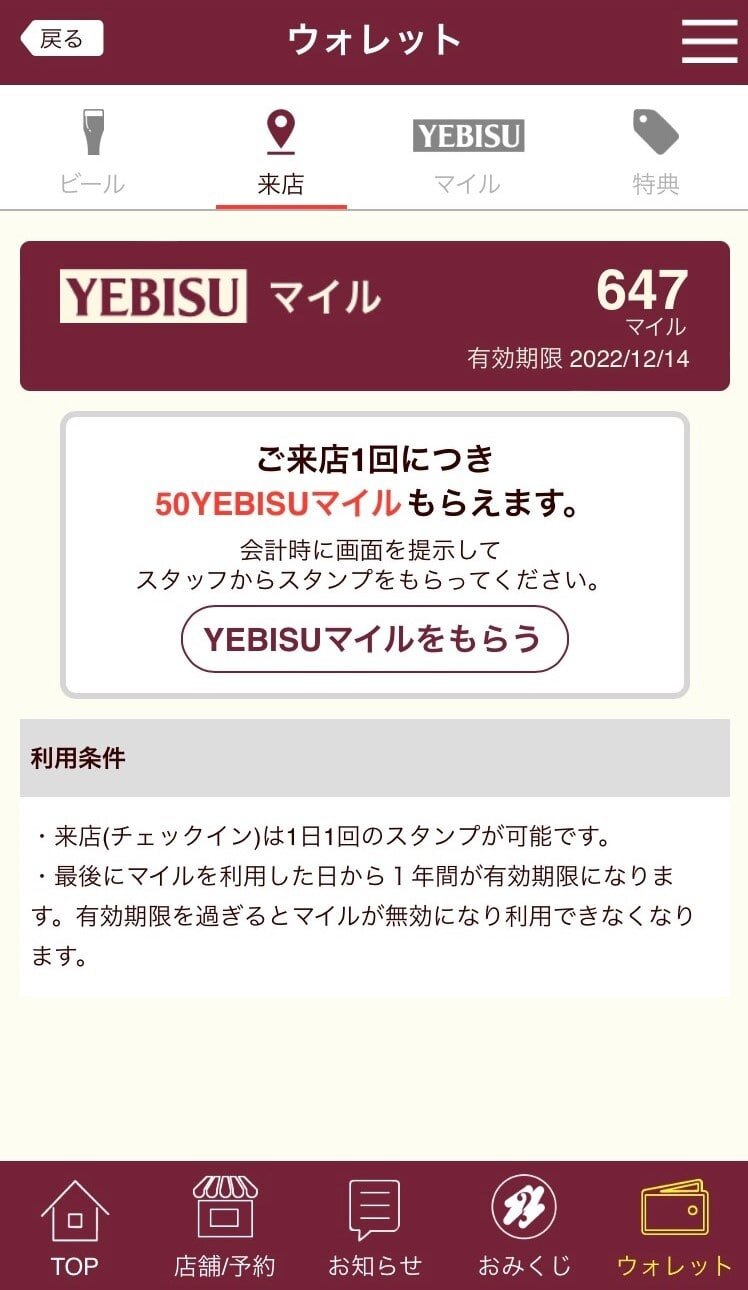 ご来店スタンプでご来店YEBISUマイルGET!